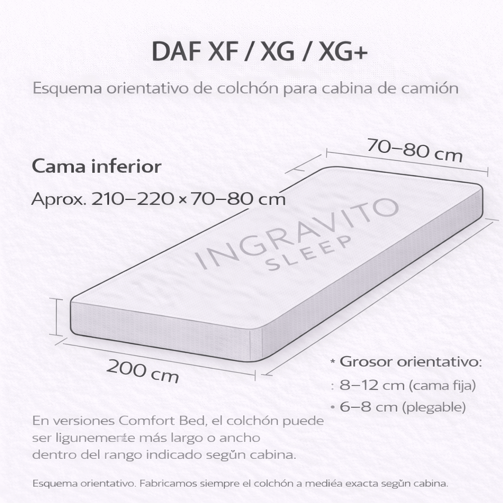 | DAF XF / XG / XG+ | Cama inferior: aprox. 210–220 × 70–80 | Camas muy utilizadas en transporte internacional; según cabina, hay versiones algo más largas y/o más anchas tipo “Comfort Bed”. |