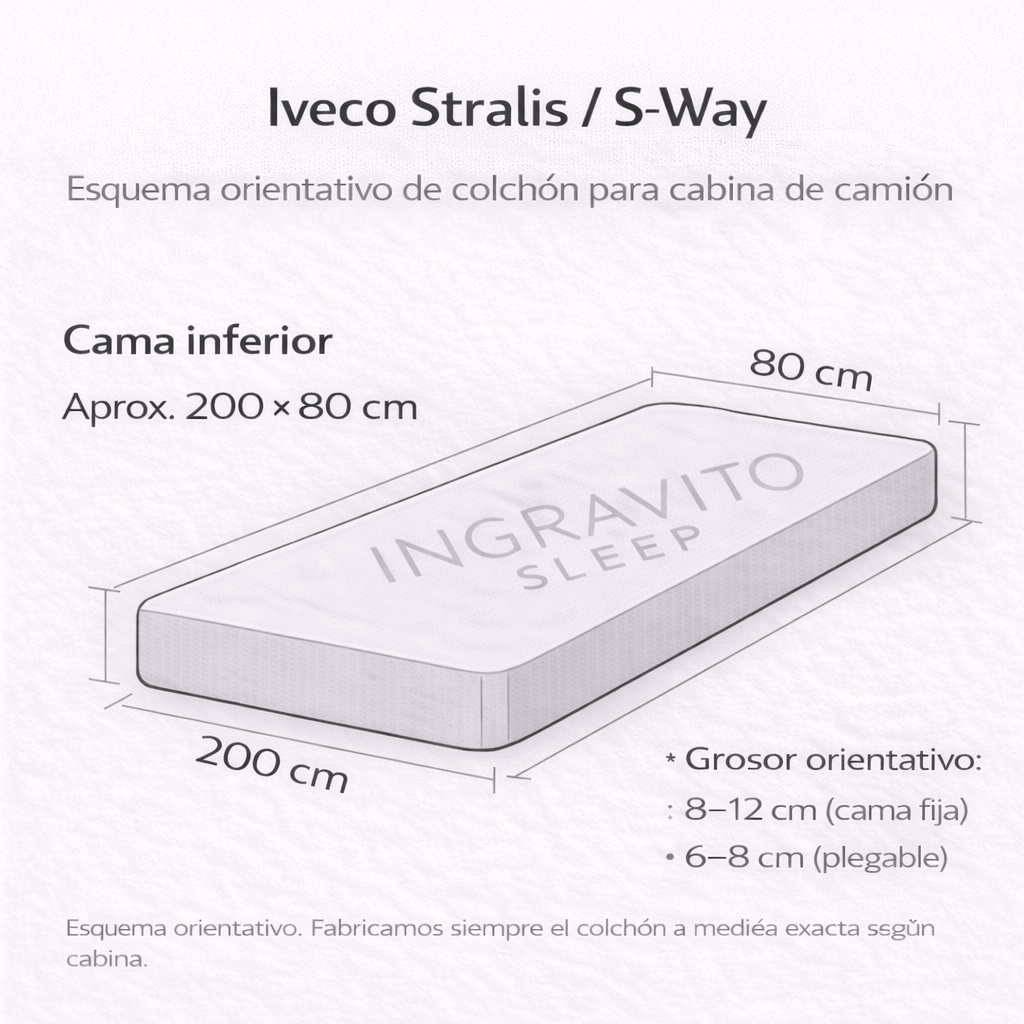 | Iveco Stralis / S-Way | Cama inferior estándar: aprox. 200 × 80 | Cama sencilla longitudinal, muy común en flotas europeas, con colchón estándar de espuma. |