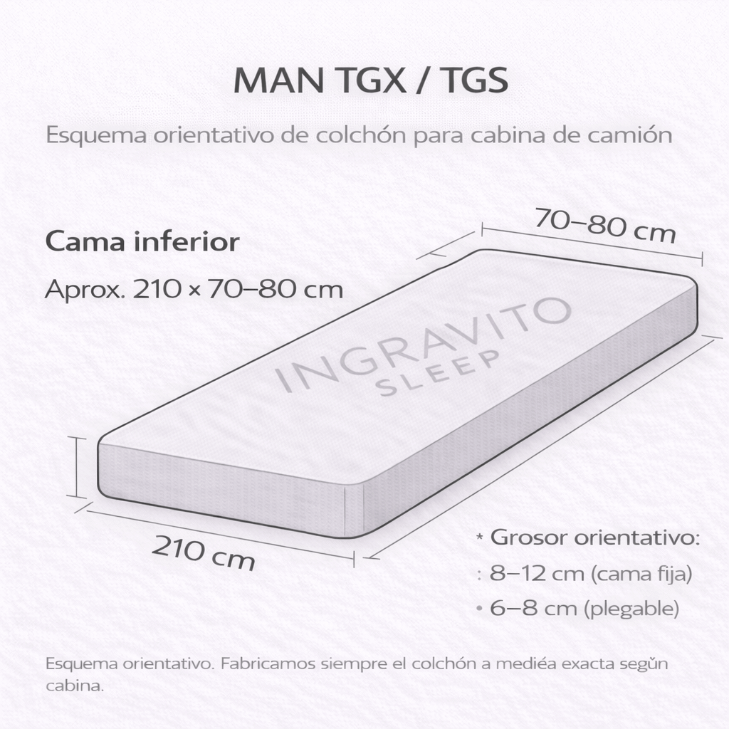 | MAN TGX (cabinas XL / XLX / XXL) | Cama inferior: aprox. 200–215 × 65–80 Cama superior (según cabina): aprox. 200 × 70 |