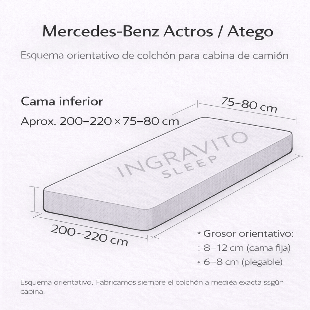 | Mercedes-Benz Actros (cabinas largas BigSpace / GigaSpace) | Cama inferior: aprox. 200–220 × 75–80 Cama superior (si la hay): aprox. 200 × 70–75 |