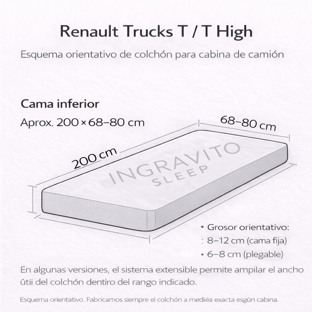 | Renault Trucks T / T High | Cama inferior “Extensia”: aprox. 200 × 68–80 (ancho de unos 68 cm, con extensión de unos 12 cm para ganar espacio de descanso). |