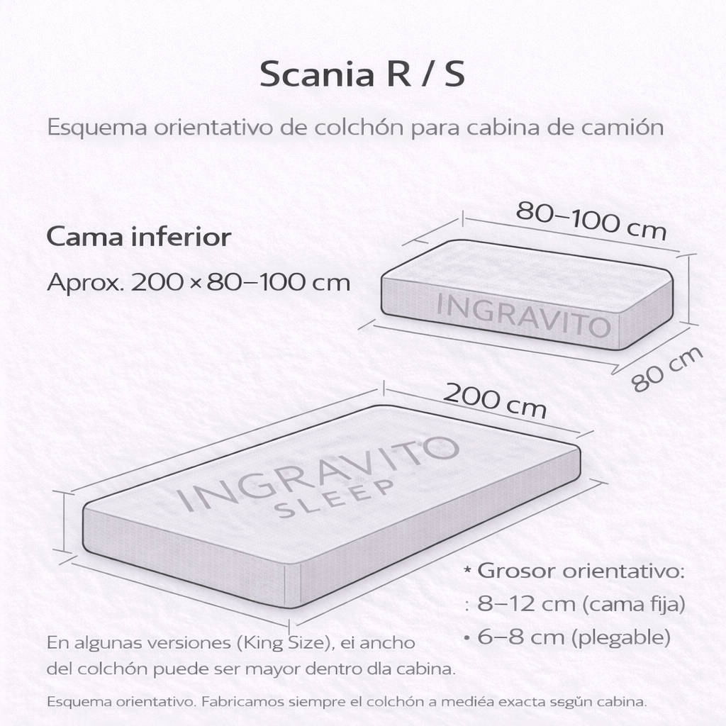 | Scania R / S (cabinas altas) | Cama inferior: aprox. 200 × 80–100 Cama superior: aprox. 200 × 60–70 |