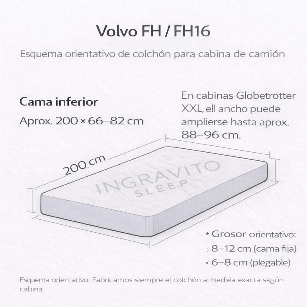 | Volvo FH / FH16 Globetrotter | Cama inferior fija o reclinable: aprox. 200 × 66–82 (ancho variable: más estrecha en la zona de los pies y más ancha en el centro; algunos modelos permiten extensión hasta ~88–96 cm de ancho). |